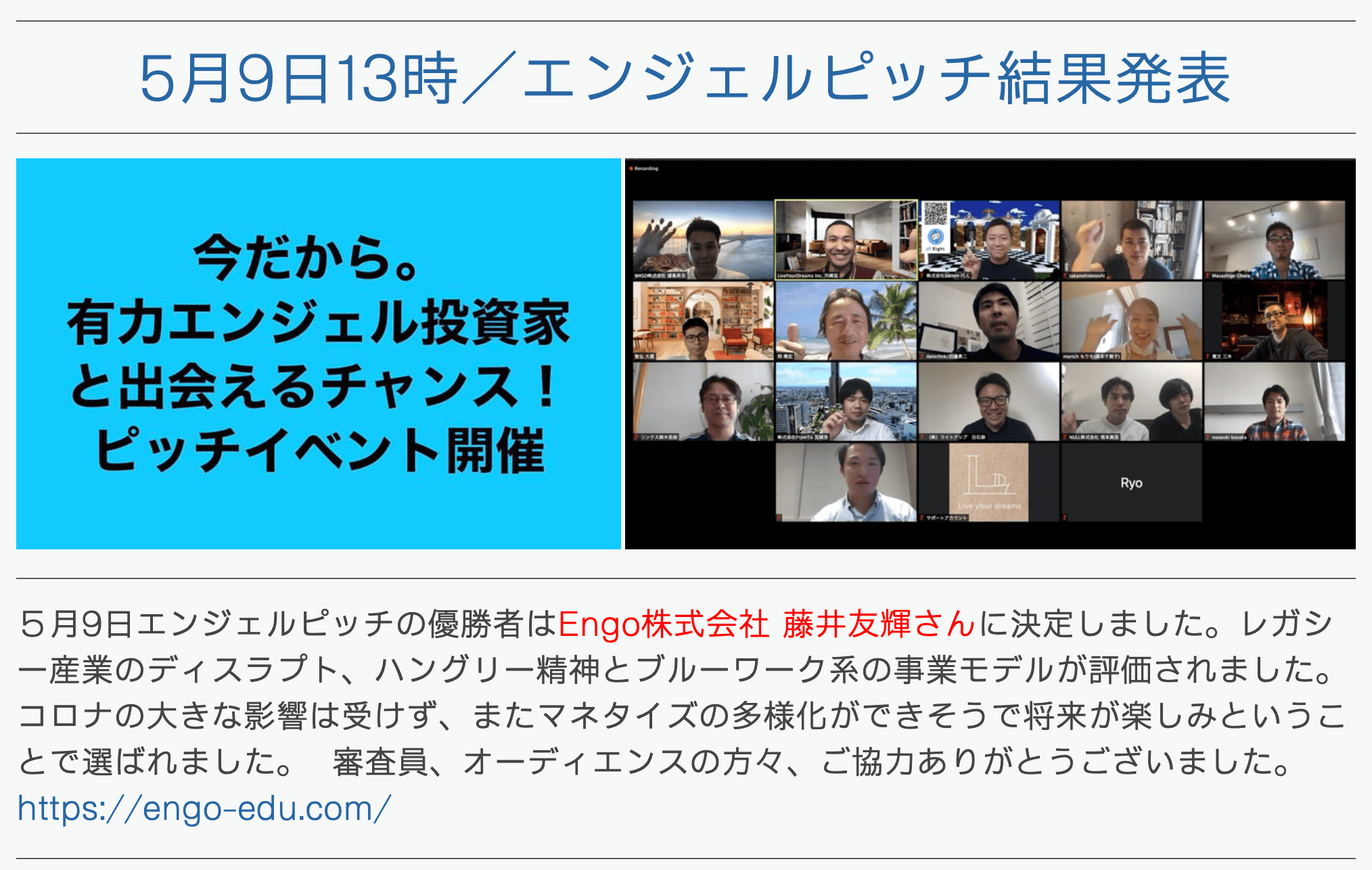 エンジェルピッチは5月9日(土)13時から14時半までで開催された、アクティブな有力エンジェル投資家5名による第1回JSSAオンラインエンジェルピッチです。